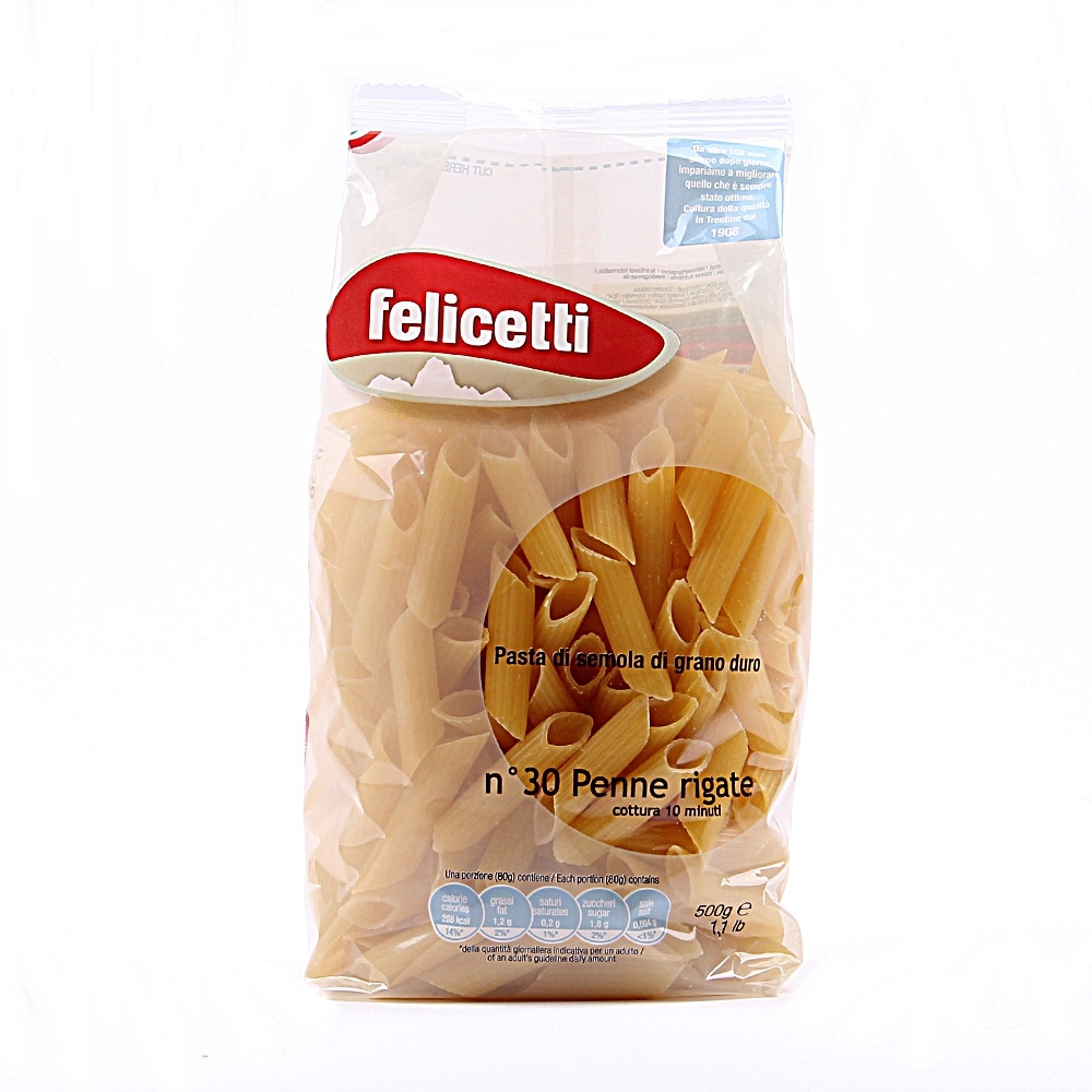 Пенне Рігате - це різновид пасти відносять до короткої пасти, з косими зрізами і ребристою поверхнею. Їх діаметр приблизно 8,0 мм, довжина 39 мм і товщина від 1,22 до 1,28 мм. Ідеально підходять для запікання пасти або пасти, приправленою м`ясним соусом з свинини або яловичини. Паста ідеальна за смаком разом з овочевими соусами, наприклад з перцю, цукіні і артишоків. |