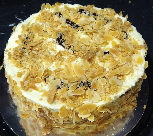 Борошно, яйця, цукор, масло вершкове, молоко згущене, джем чорна смородина, мигдальні пластівці