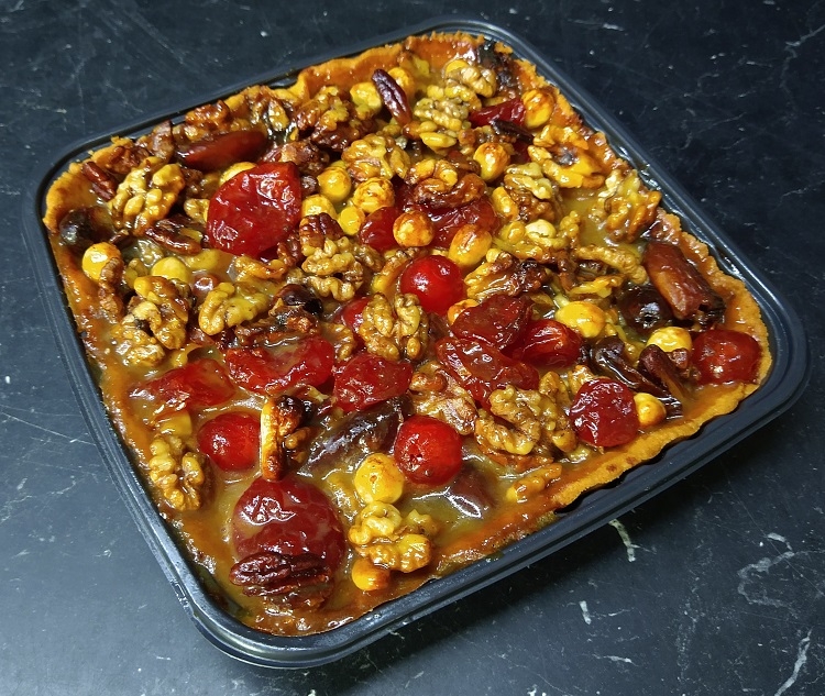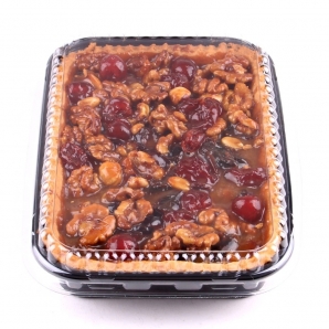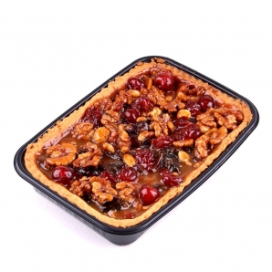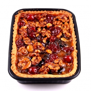 Асорті сухофруктів та горіхів, під карамеллю, на основі ванілі та помаранчевого фрешу, приготованого за нашою власною рецептурою, в тарті з пісочного тіста, запеченої в печі. Склад: тісто пісочне, карамель, горіх волоський, кеш`ю, фундук, журавлина, кізіл, мед, масло. Термін придатності 72 годин при температурі +4. |