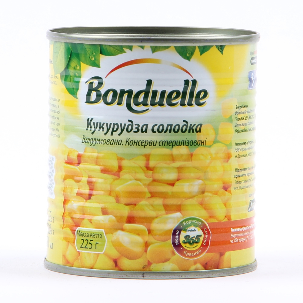 Кукурудза золотиста, ніжна і соковита. Популярний інгридієнт для салатів. Склад: солодка кукурудза в зернах, вода питна, цукор-пісок, сіль кухонна харчова. |