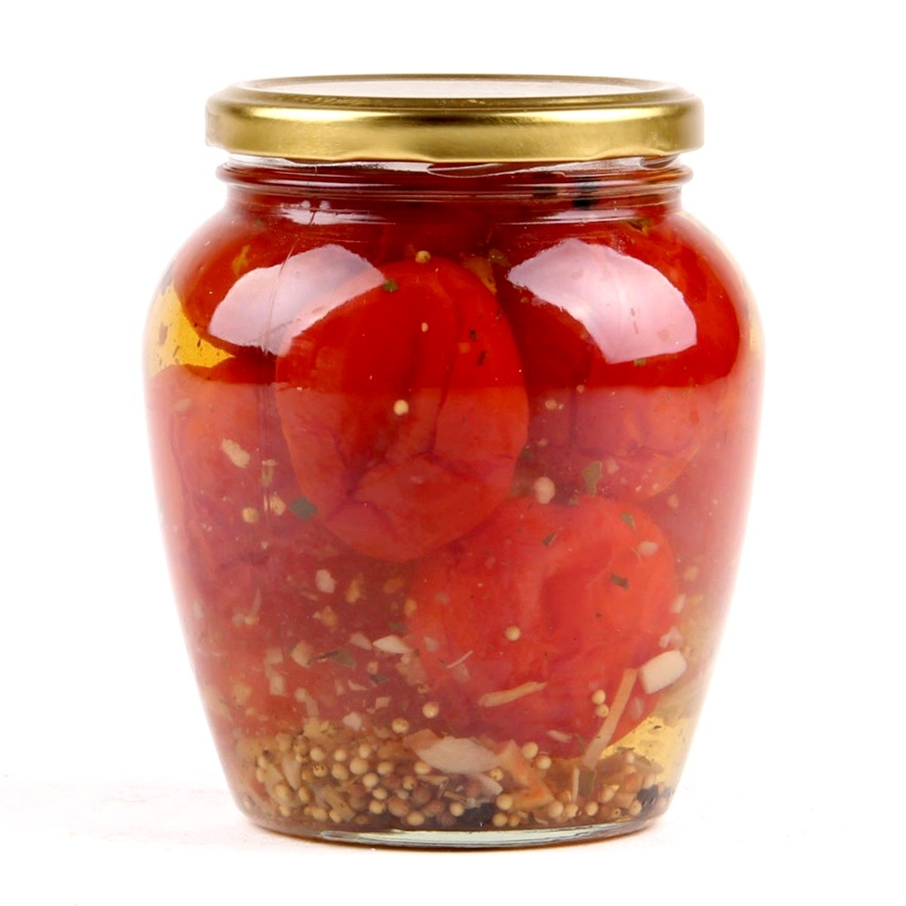 Помідори не відрізняються різкою кислинкою, мають приємну, ледь відчутну солодкість. Відмінно підходять в якості пікантної закуски або використовуються як самостійна страва. Склад: помідори, цукор, сіль, спеції. Врожай 2016 року. |