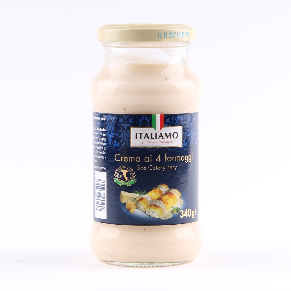 Натуральний соус Italiamo Crema ai 4 formaggi - це вершково-сирний соус з чотирьох видів сиру: Асьяджіо, Горгонзола, Монтасьйо, Фонталь. Продукт стерилізований. |