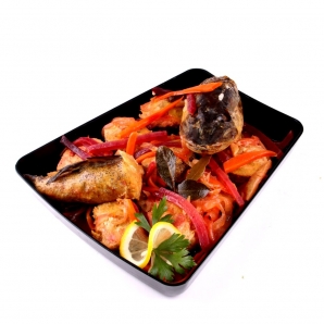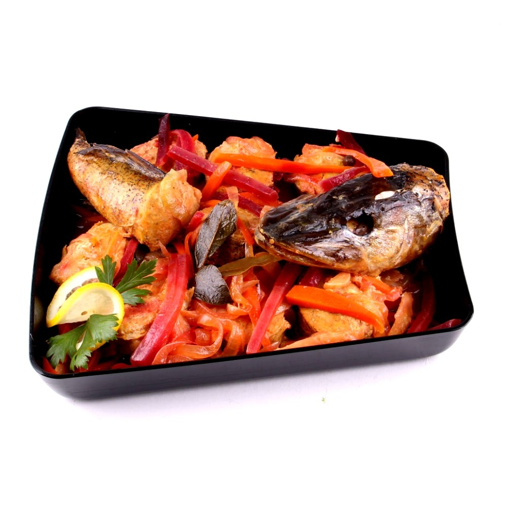 Шматки фаршированої щуки томлені в печі в грибному соусі з білими грибами і лисичками.