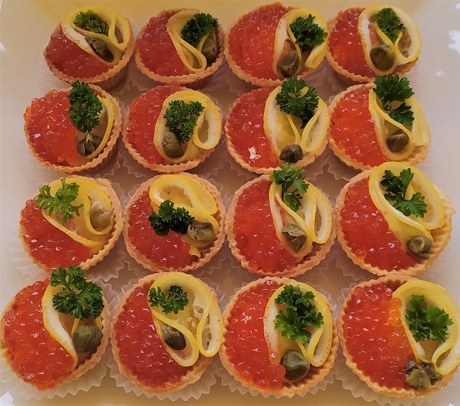 Тісто пісочне солоне з додаванням кардамону. Олія вершкове, червона ікра-13г, лимон, квітка каперса та петрушка